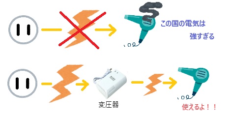 上記、図のように変圧器を使用する事によって、海外でも日本と同じ電気の強さに調整する事ができる為、海外でも問題なく日本の電化製品が使用できるようになります。