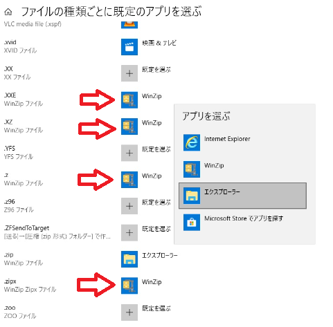 先ほどもお話した通り、実際にはWINZIPが無くてもファイルは解凍できるのだが、うっかり一緒にダウンロードしてしまうと、下記画像のようにデフォルトの圧縮解凍ソフトが全てWinZipに切り替わります。
