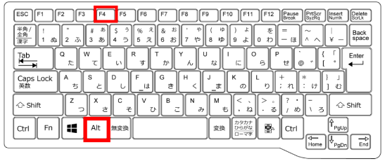 「Altキー」を押しながら「F4キー」を押すと、現在開いているプログラムを強制的に閉じる事ができます。
