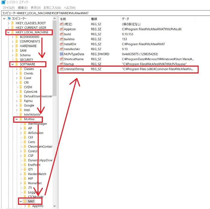 レジストリエディターが表示されたら「HKEY_LOCAL_MACHINE」→「SOFTWARE」→「McAfee」→「MAT」の順に進み「UninstallStrins」を選択します。
